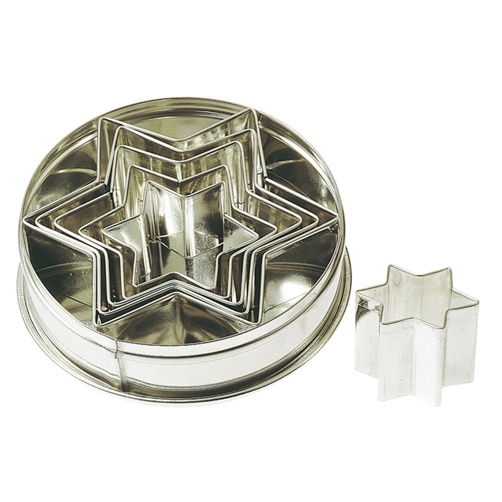 Hochwertige Stern-Ausstecher aus Weissblech, glatt, 6-teilig, geliefert in einer praktischen Dose zur ordentlichen Aufbewahrung. Nicht spülmaschinengeeignet. Grösse: 42 - 115 mm.