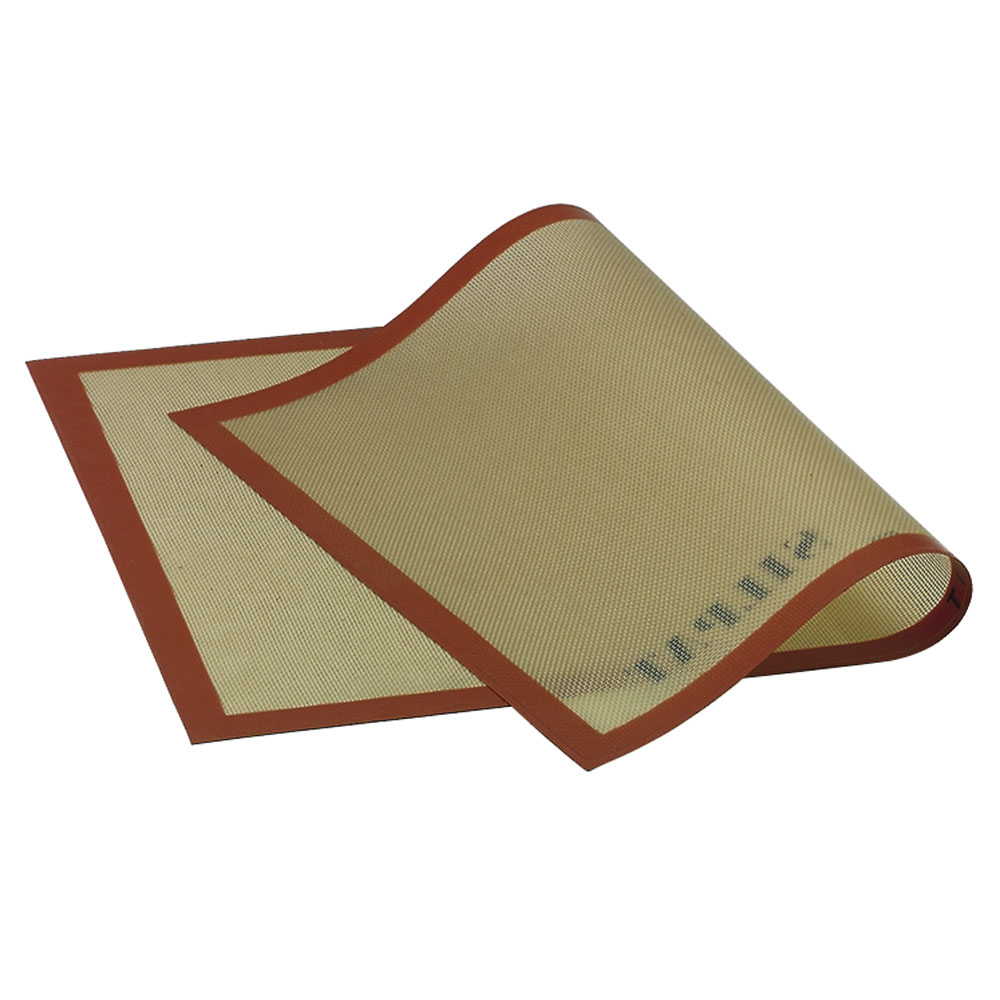 Vielseitige Backmatte Silpat, die sich ideal für Zuckerarbeiten eignet (süße Produkte, klebrige Zutaten). Mit glatter Oberfläche und körniger Seite, die das Rutschen auf einem Blech verhindert. Aus Fiberglasgewebe mit Silikonbeschichtung. Reinigung mit warmem Wasser und einem weichen Schwamm. Nicht schnittfest!