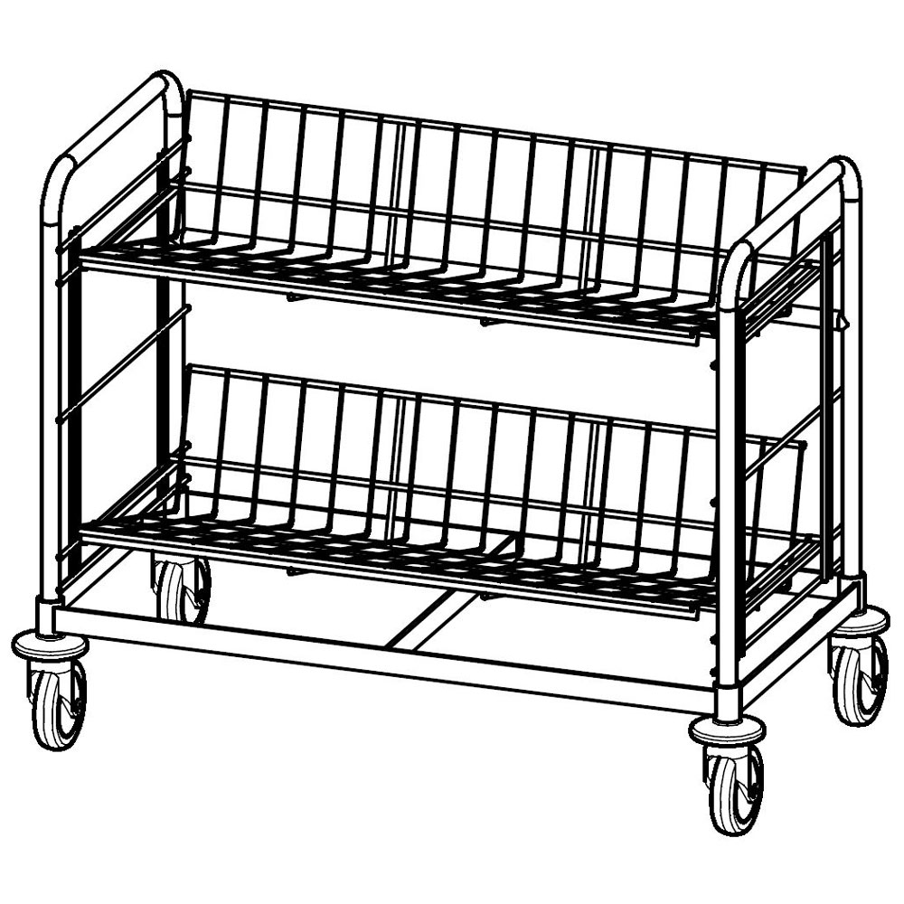 Robuste Rahmenkonstruktion aus verchromtem Rundstahl, fahrbar durch vier korrosionsgeschützte Lenkrollen Ø 125 mm mit Abweisrollen, davon zwei feststellbar, Höhenabstand zwischen den Borden 385 mm. Gestell niedrig oder hoch wählbar.