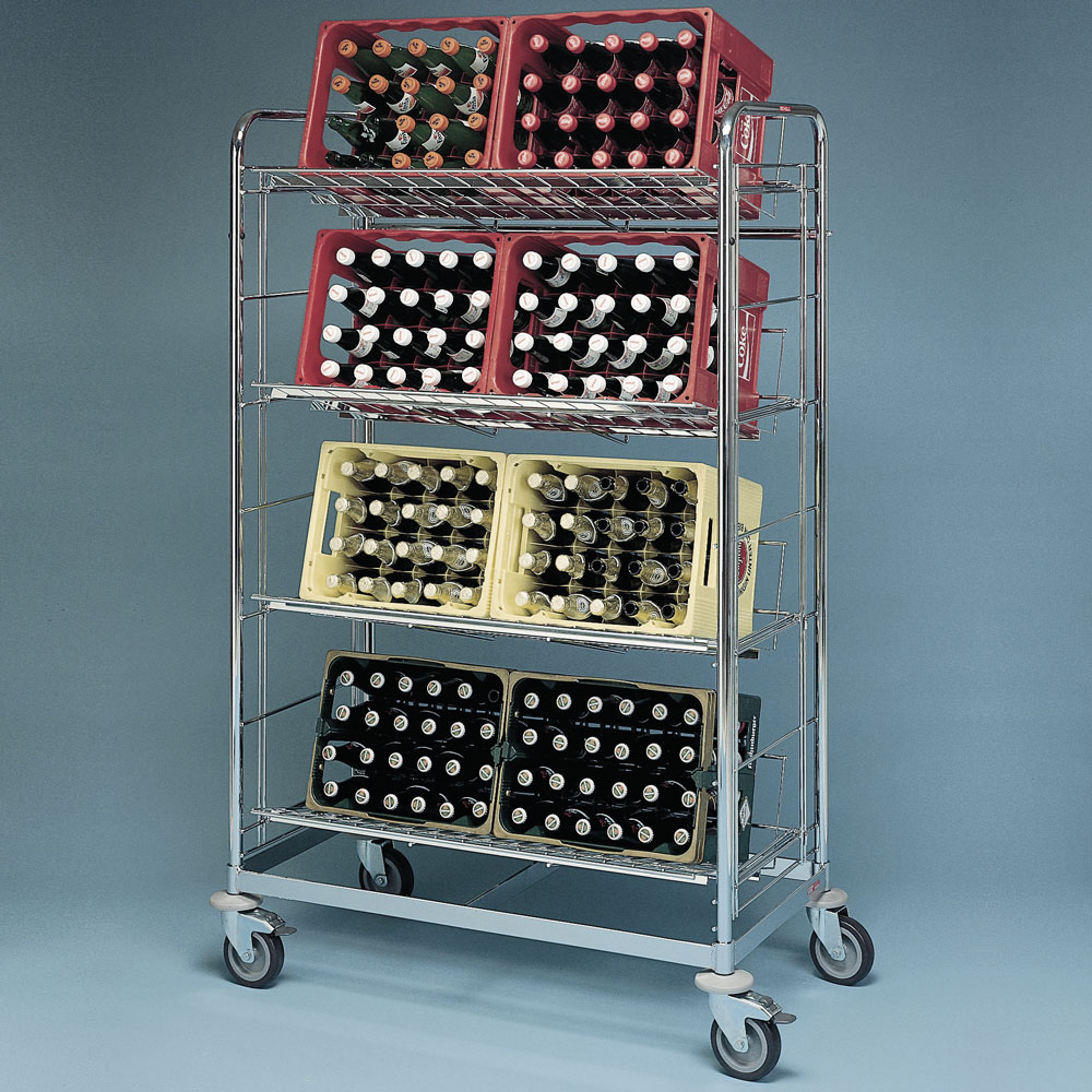 Robuste Rahmenkonstruktion aus verchromtem Rundstahl, fahrbar durch vier korrosionsgeschützte Lenkrollen Ø 125 mm mit Abweisrollen, davon zwei feststellbar, Höhenabstand zwischen den Borden 385 mm. Gestell niedrig oder hoch wählbar.