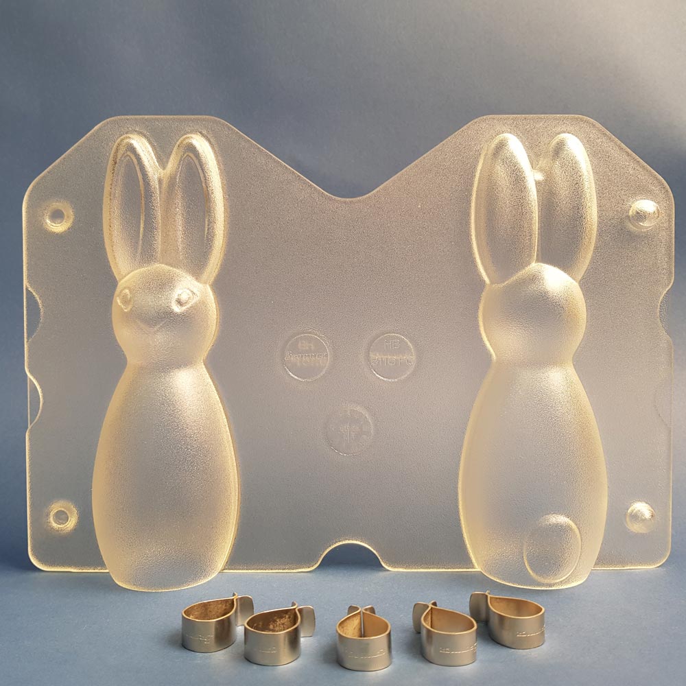 Mit dieser Schokoladenform aus gespritzten Polycarbonat können Sie ganz einfach Ihre eigenen Osterhasen im aussergewöhnlichen Design giessen. Doppelform wird mit Klammern ausgeliefert.