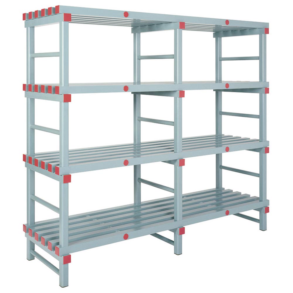 Vorratsgestell aus Kunststoff, 5 Tablare, stabil und stossfest, einfache Montage ohne Werkzeug, erweiterungsfähig, temperaturbeständig von -40 bis +80° C, Farbe blau-grau, Tragkraft 200 kg pro Tablar und Laufmeter, Bodenabstand 120 mm. Verschiedene Grössen und Zusammenstellungen auf Anfrage.