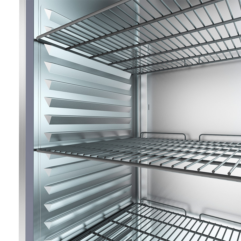 aus Edelstahl. 20 Auflagesicken 55 mm Abstand in Seitenwände integriert, 4 Roste plastifiziert GN 2/1 650x530 mm, Beleuchtung, Türschloss, selbstschliessende Tür bei Öffnungswinkel unter 90°, digitaler Thermometer-Thermostat, Automatische Abtauen und Verdampfung des Kondenswasser, Umluftkühlsystem, Warnsignal optisch und akustisch, Türe rechts gebandet. Der Lagertiefkühlschrank darf nur mit gekühlter Ware befüllt werden.