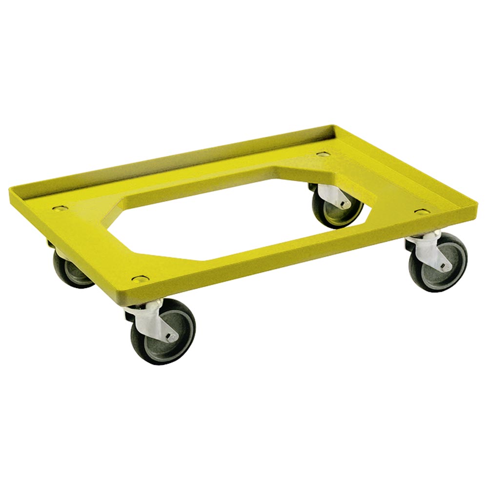 Stabiler Rolli aus Kunststoff für Transportkörbe bis 600 x 400 mm, vier Gummirollen, Tragkraft bis 250 kg.