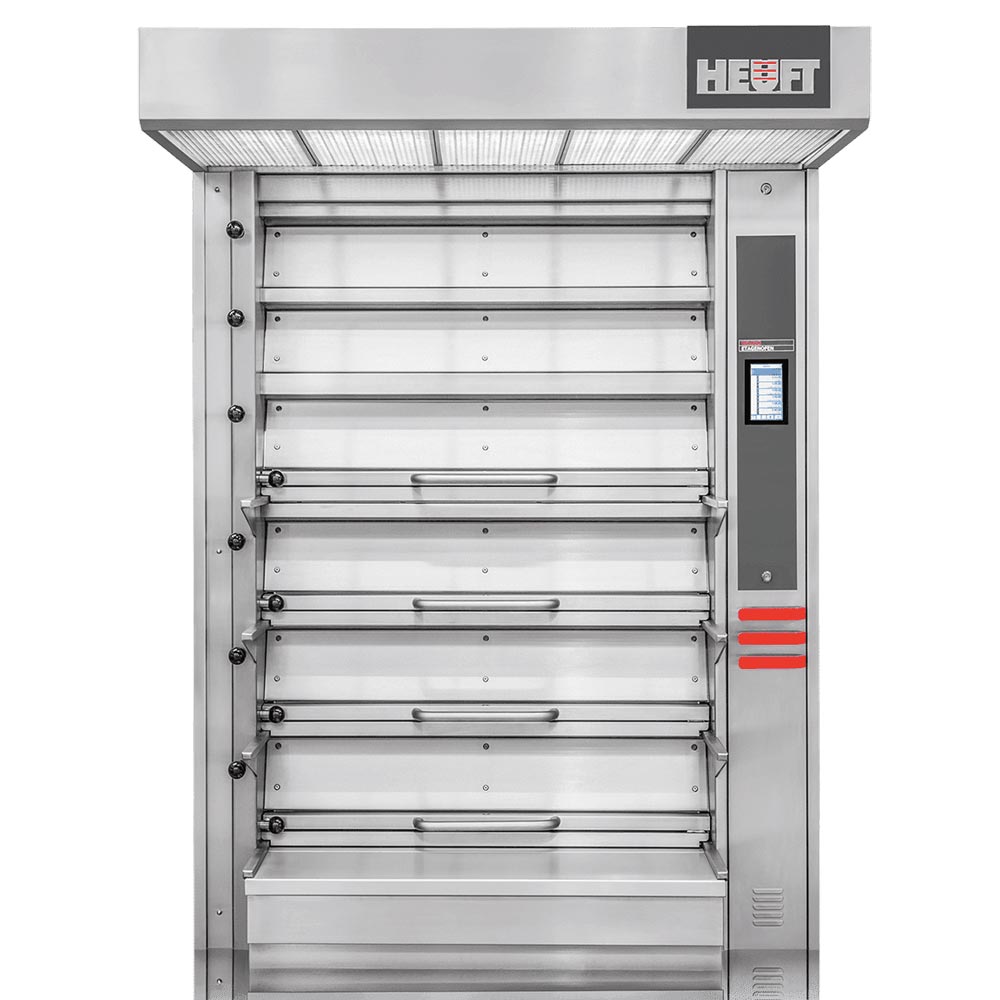 Der VULKAN THERMO-OEL® Etagenofen bietet individuelles Backen auf höchstem Niveau: Gleichmäßige Bräunung, saftige Krume und stabile Rösche - jedes Produkt erhält den gewünschten Charakter. Besonders vorteilhaft für den Backprozess ist der reichliche Schwaden, der jederzeit verfügbar ist. Der Schwadenapparat wird wie der Etagenofen selbst über Thermo-Öl beheizt, was sicherstellt, dass die gesamte Fläche schnell und gleichmäßig mit Dampf benetzt wird. Dabei zeigt sich der Heuft Etagenofen unbeeindruckt von der Belegungsdichte. Ob nur einzelne Herde bestückt sind oder die Backleistung voll ausgeschöpft wird, das Ergebnis am Ende der Backzeit bleibt stets gleich. Zusätzlich punktet der Thermo-Öl Ofen mit Komfort. Optional können bis zu vier Auszugsherde die Ofenarbeit erleichtern und die Beladung vereinfachen. Die Touch-Screen-Steuerung ist einfach und intuitiv zu bedienen und wird bereits in der Grundversion mit manueller Beschickung serienmäßig mit einer speicherprogrammierbaren Steuerung ausgestattet.