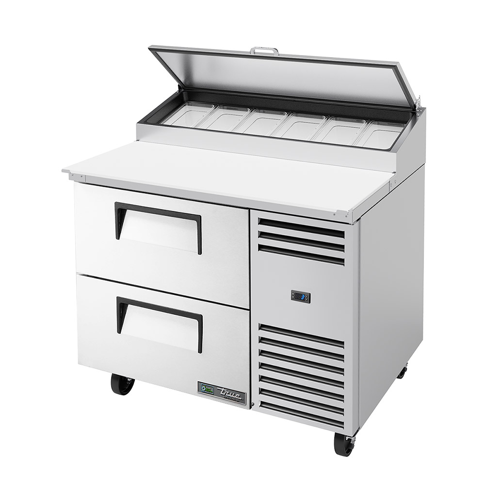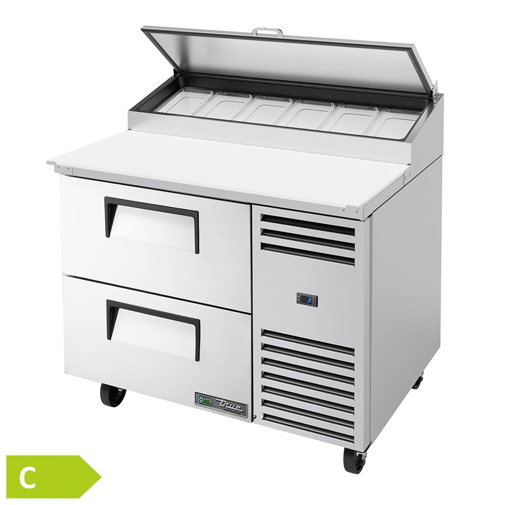 Les systèmes de réfrigération par air pulsé brevetés de True assurent un refroidissement uniforme de tous les récipients d'ingrédients et maintiennent une température constante entre 0,5 °C et 5 °C. Les dispositions flexibles des bacs GN, les couvercles à faible consommation d'énergie ainsi que les tiroirs et les portes configurables individuellement offrent une adaptabilité maximale aux différents besoins de la cuisine. Des solutions spéciales telles que le Topping Catcher et le moteur de ventilateur réversible optimisent le déroulement du travail, réduisent le gaspillage et minimisent l'entretien. Grâce à des composants modernes et à des réfrigérants respectueux de l'environnement, les appareils offrent une grande efficacité énergétique pour des performances sans compromis.